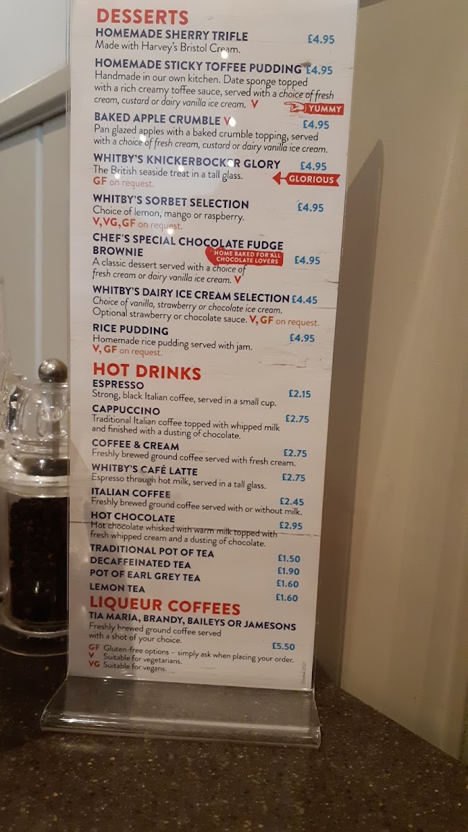 A standout on Whitby's Menu is the mushy peas-creamy and flavorful, they complement the fried items with a nice earthy depth. Gluten-free options and children’s meals are also available, ensuring everyone is catered for, including those with dietary restrictions or smaller appetites. For dessert, traditional British puddings such as sticky toffee or treacle sponge round off the experience with nostalgic comfort.